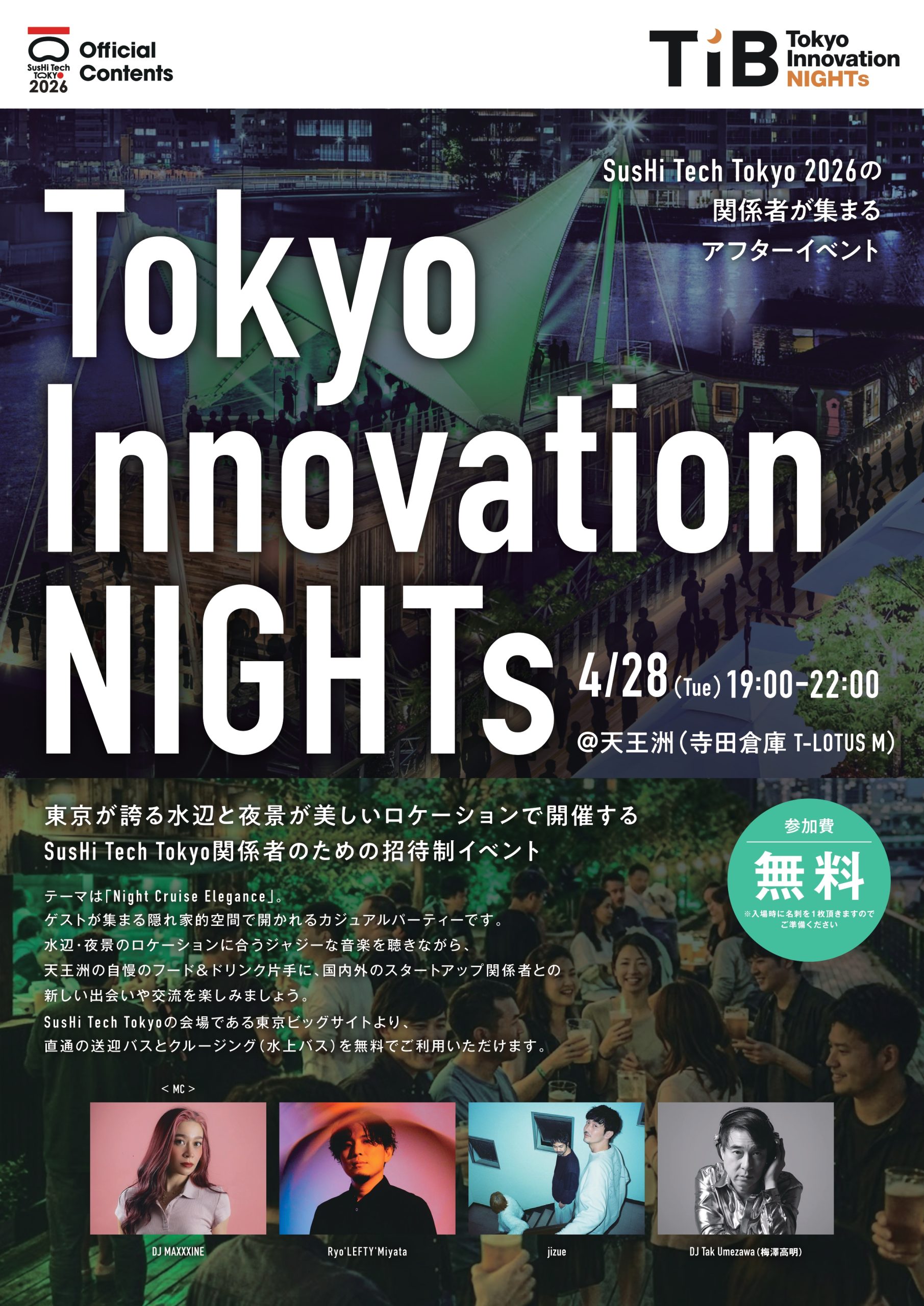 テーマは「Night Cruise Elegance」。ゲストが集まる隠れ家的空間で開かれるカジュアルパーティーです。水辺・夜景のロケーションに合うジャジーな音楽を聴きながら、天王洲の自慢のフード&ドリンク片手に、国内外のスタートアップ関係者との新しい出会いや交流を楽しみましょう。SusHi Tech Tokyo2026の会場である東京ビッグサイトより、直通の送迎バスとクルージング(水上バス)を無料でご利用いただけます。