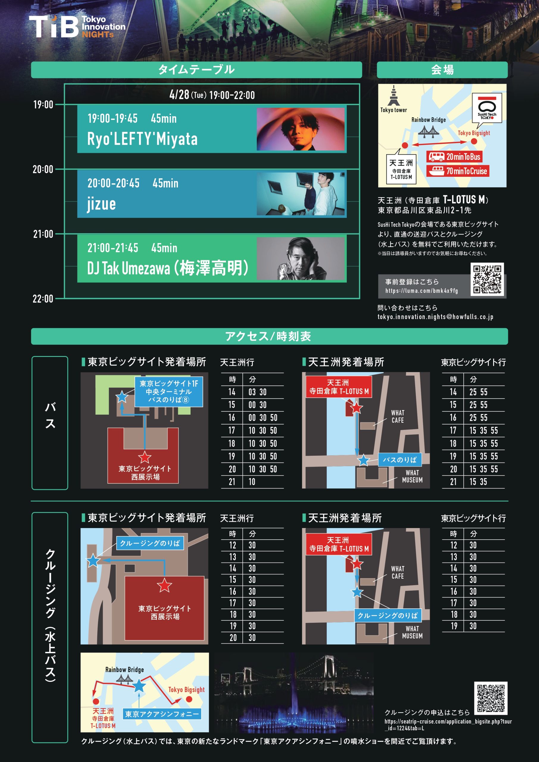 Guests may access the event via a FREE shuttle bus and shuttle cruise from Tokyo Big Sight, the venue of SusHi Tech Tokyo.