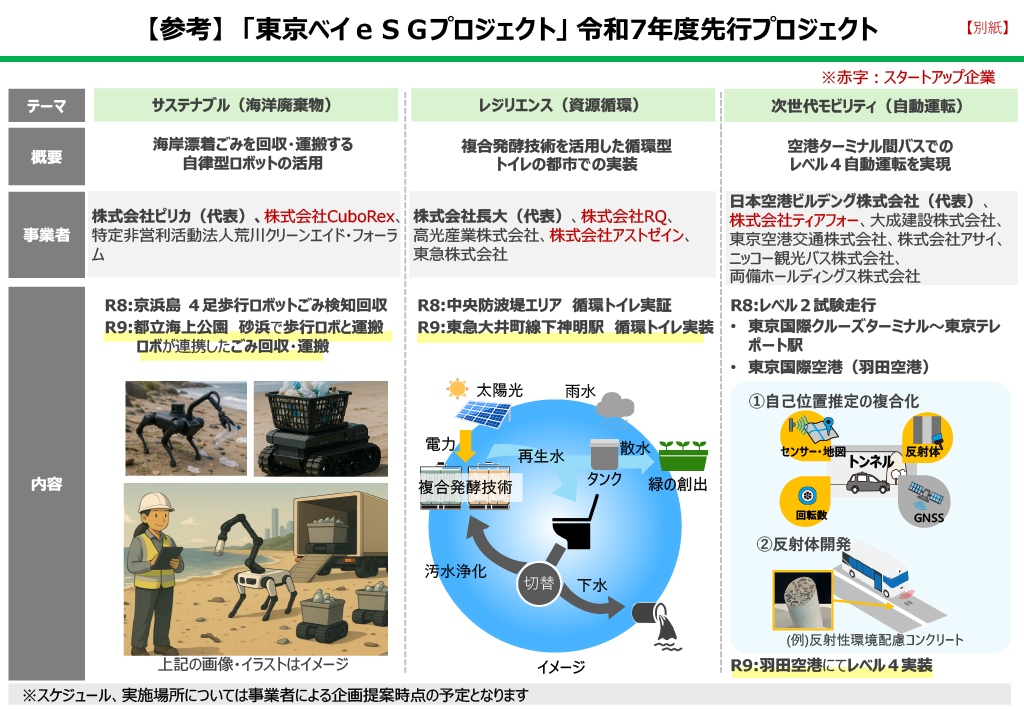 ・ベイエリアでのゼロエミッションやサーキュラーエコノミーの実現に資する、「次世代モビリティ・ロボティクス」、「最先端再生可能エネルギー」、「環境改善・資源循環」の3分野の技術を活用したプロジェクト
