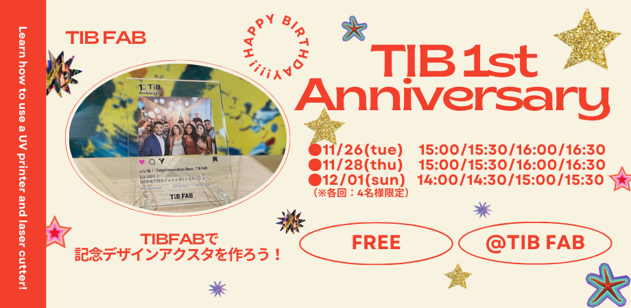 期間中、TIB FAB会員によるピッチや展示ブースを設けたランチ交流会やTIB1周年記念デザインを施したアクリルスタンドを作るワークショップを開催いたします。